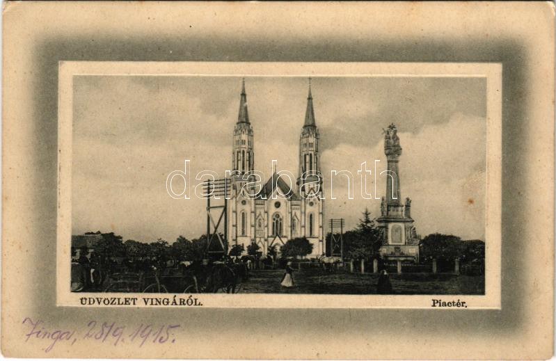 1915 Vinga, Piactér, Római katolikus templom, Szentháromság szobor. W.L. Bp. 5430. / market square, Catholic church...
