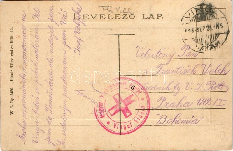 1915 Vinga, Piactér, Római katolikus templom, Szentháromság szobor. W.L. Bp. 5430. / market square, Catholic church, Holy Trinity statue + "Magyar Vöröskereszt Egylet Vingai Fiókja" (fl)