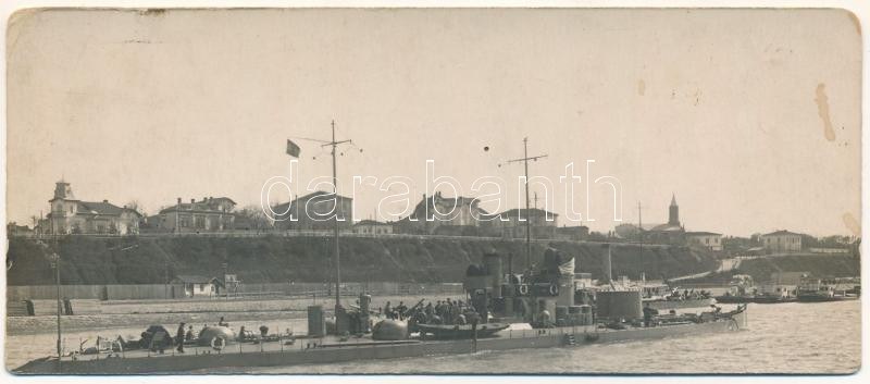 1916 K.u.K. Kriegsmarine Donauflottille / Császári és Királyi Haditengerészet Dunaflottilla SMS "TEMES II" (SMS BOSNA) monitor Ruszcsuknál (Rusze, Rustschuk) / WWI Austro-Hungarian Navy Danube Flotilla river guard monitor SMS TEMES II (SMS BOSNA) Starboard side of SMS TEMES II under the cliffs at Ruse (Russe), Bulgaria, in 1916. The port is busy with military traffic and several vessels can be seen in the background. photo (13,8 cm x 5,9 cm) (kopott sarkak / worn corners)