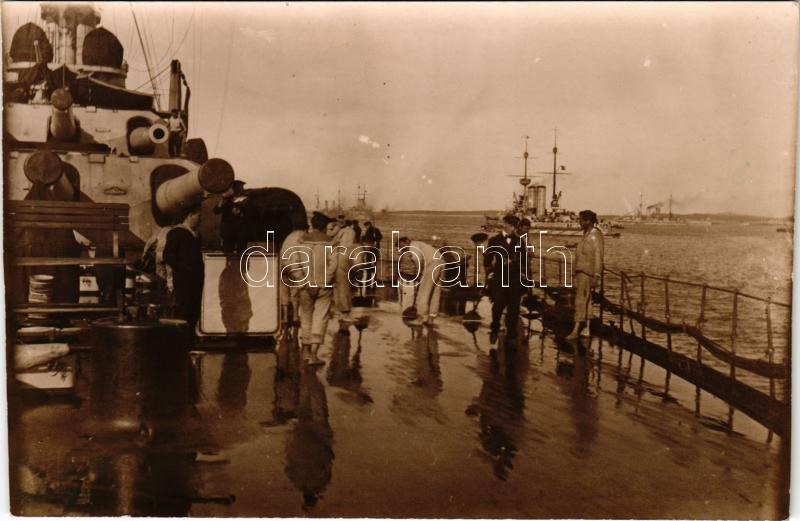 1916 SMS PRINZ EUGEN Osztrák-Magyar Haditengerészet pre-dreadnought csatahajó matrózai felmossák a fedélzetet / K.u.K...
