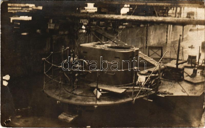 1917 K.u.K. Kriegsmarine Donauflottille / Császári és Királyi Haditengerészet Dunaflottilla elsüllyedt "TEMES" (I) monitor kiemelése / WWI Austro-Hungarian Navy Danube Fleet sunken river guard monitor SMS TEMES (I) being raised, mid-June 1916. The monitor's deck is above water and the smokestack and the superstructure have been dismounted. photo (kopott sarkak / worn corners)