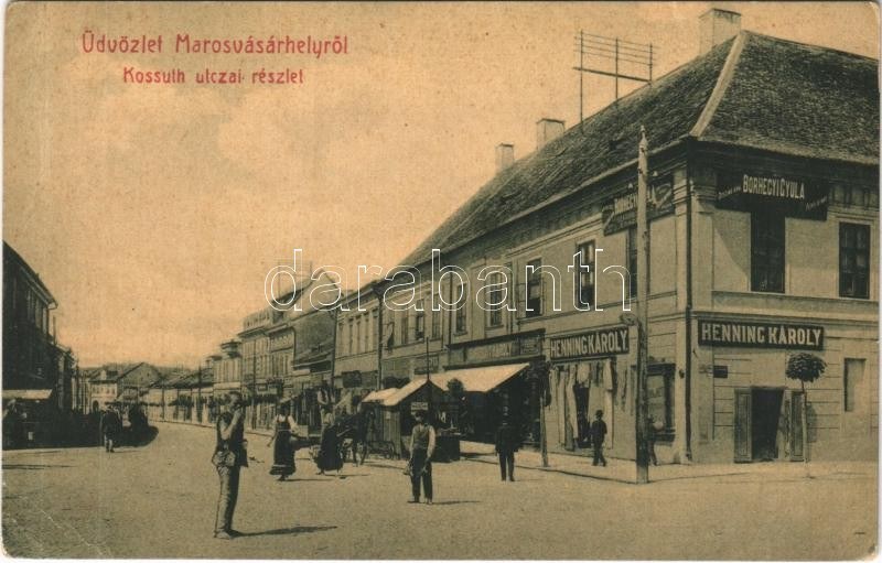 1917 Marosvásárhely, Targu Mures; Kossuth utca, Borhegyi Gyula, Henning Károly, Bartscht Károly, Babos Egyed üzlete...