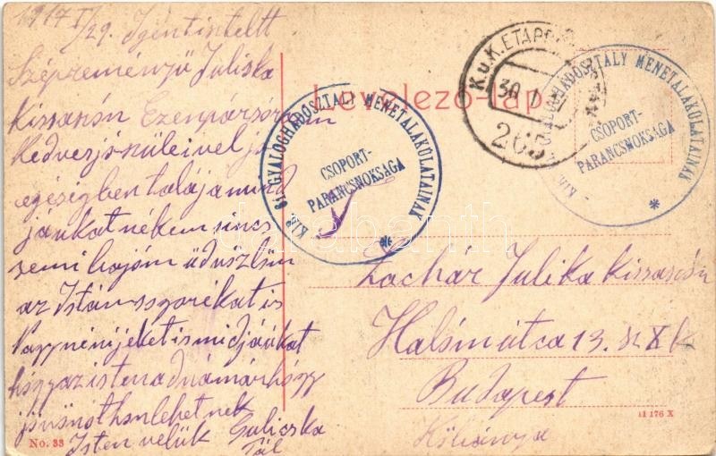 1917 Marosvásárhely, Targu Mures; Kossuth utca, Borhegyi Gyula, Henning Károly, Bartscht Károly, Babos Egyed üzlete, utcai árusok. W.L. (?) No. 33. / street, shops, street vendors + "M. KIR. 61. GYALOGHADOSZTÁLY MENETALAKULATAINAK CSOPORTPARANCSNOKSÁGA" (EK)