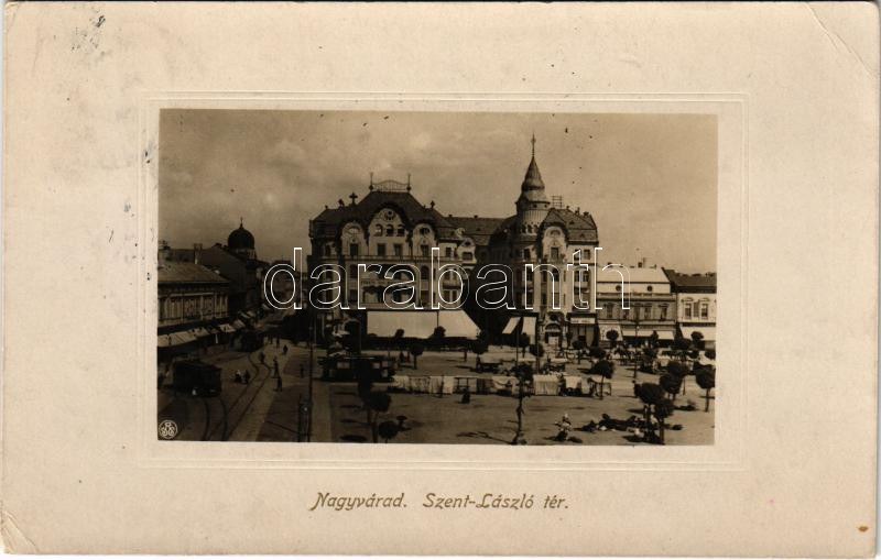 1917 Nagyvárad, Oradea; Szent László tér, villamos, Fekete Sas nagyszálloda, zsinagóga, piac, Cziller Imre üzlete ...