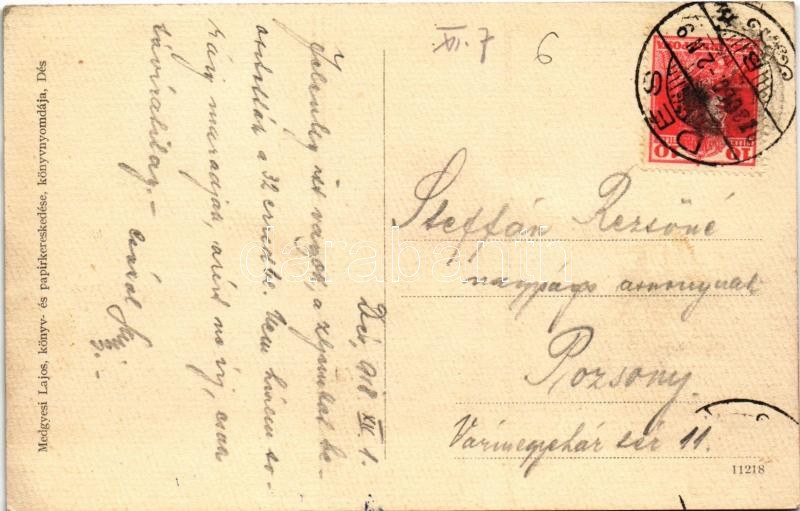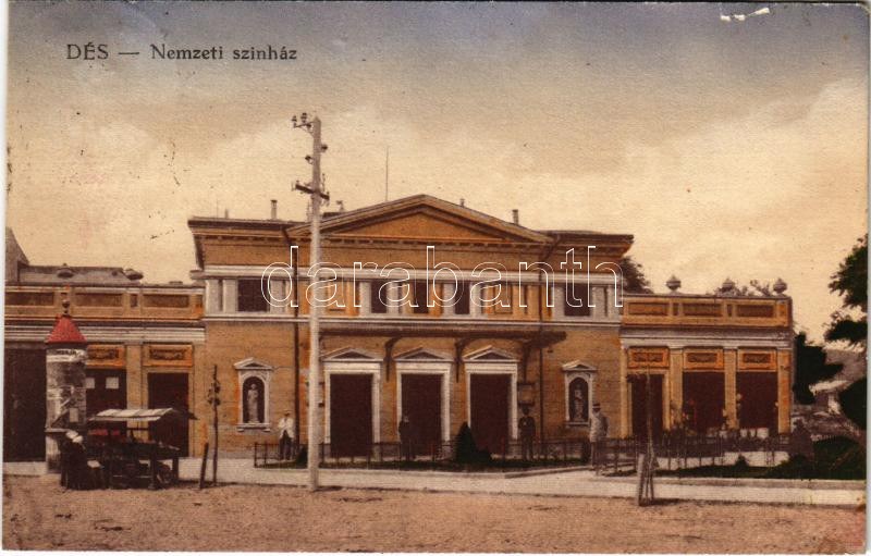 1918 Dés, Dej; Nemzeti színház, piaci árusok, hirdetőoszlop. Medgyesi Lajos kiadása / theatre, market vendors...