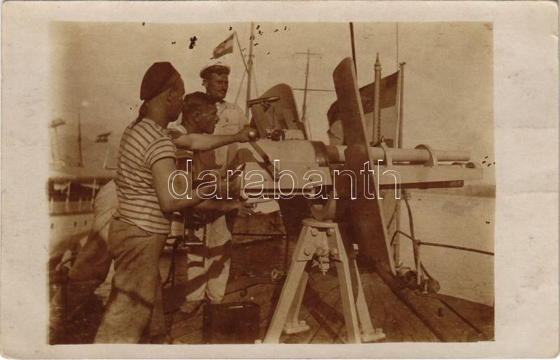 1918 SMS METEOR az Osztrák-Magyar Monarchia Meteor-osztályú torpedóhajó matrózai lőgyakorlat közben, gyorstüzelő fegyver / K.u.K. Kriegsmarine Matrosen / Austro-Hungarian Navy torpedo gunboat's mariners practicing shooting with a 47 mm, cal. 33, Hotchkiss-system rapid fire gun. photo