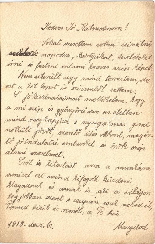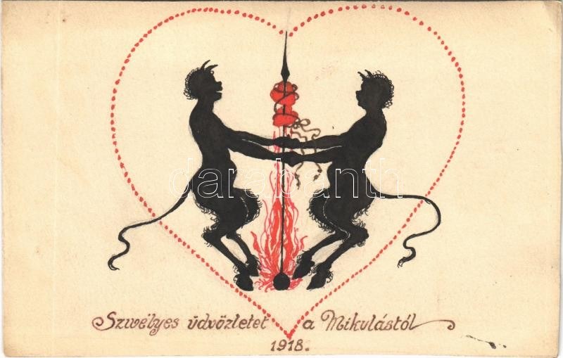 1918 Szívélyes üdvözletet a Mikulástól. Krampuszok, kézzel rajzolt / Krampus greeting hand-drawn art postcard (EK...
