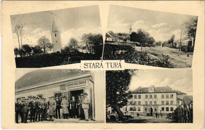 1927 Ótura, Stará Turá, Alt-Turn; utcaképek, templom, iskola, Özvegy Elena Malárová könyv és papír üzlete ...