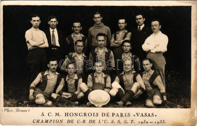 1932-1933 S.C.M. Hongrois de Paris Vasas. Champion 1932-1933. / a VASAS SE futball játékosai Párizsban, focisták, csoportkép / football players of VASAS SC in Paris. photo + So. Stpl (EB)