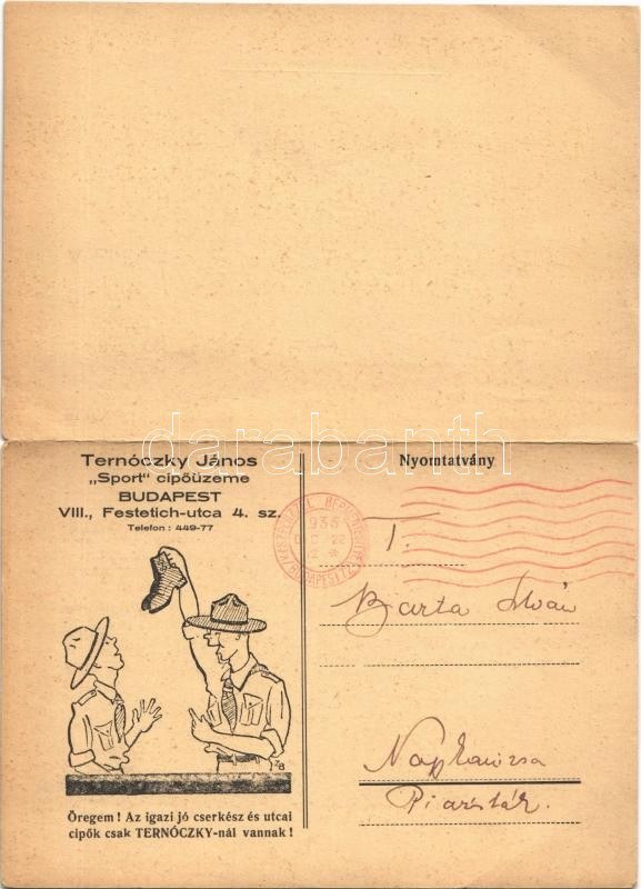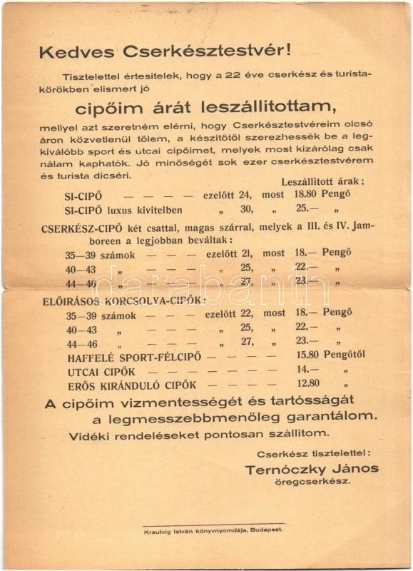 1933 Öregem! Az igazi jó cserkész és utcai cipők csak Ternóczky-nál vannak! Ternóczky János 'Sport" üzeme. Budapest, Festetich utca 4. Kinyitható képeslap belül árjegyzékkel / Hungarian scout shoes' shop advertisement. Folding postcard with price list inside