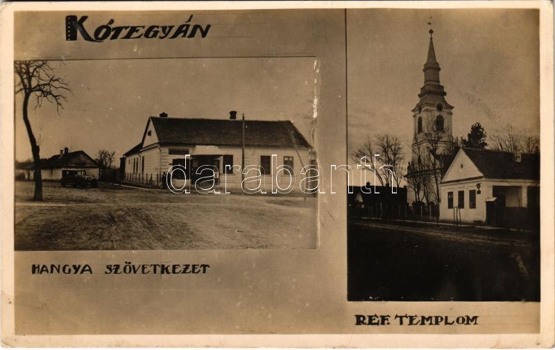 1934 Kötegyán (Békés), Református templom, Hangya szövetkezet üzlete és saját kiadása, automobil (fl...