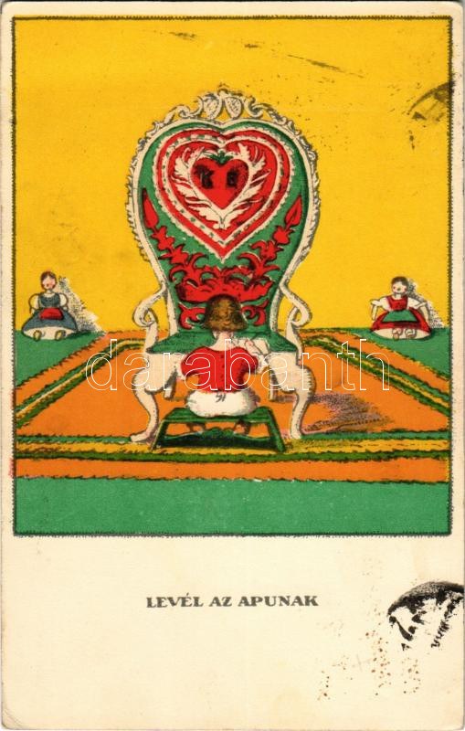 1935 Levél az apunak. Egy jó kislány viselt dolgai I. sorozat 4. szám. Radó kiadása / Letter to dad. Hungarian art postcard s: Kozma Lajos (tűnyom / pinmark)