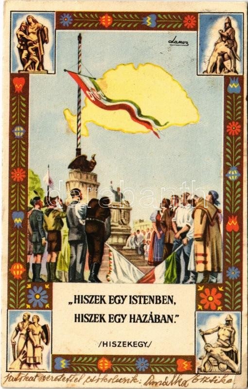1937 Hiszek egy Istenben, hiszek egy hazában. Hiszekegy. Irredenta szoborcsoport. Kiadja az Ereklyés Országzászló Nagybizottsága / Hungarian irredenta propaganda, Hungarian flag, Trianon s: Lamoss (EK)
