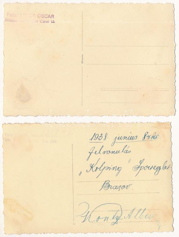 1938 Brassó, Kronstadt, Brasov; Kolping mozgalom sportegyletének felvonulása június 8-án, náci karlendítések, háttérben Ageco Bodega étterem, üzletek. Foto Adler Oscar / Hungarian parade of the sports club of the Kolping Society (Kolpingwerk), Nazi salute, restaurant, shops - 2 db eredeti fotó / 2 original photos