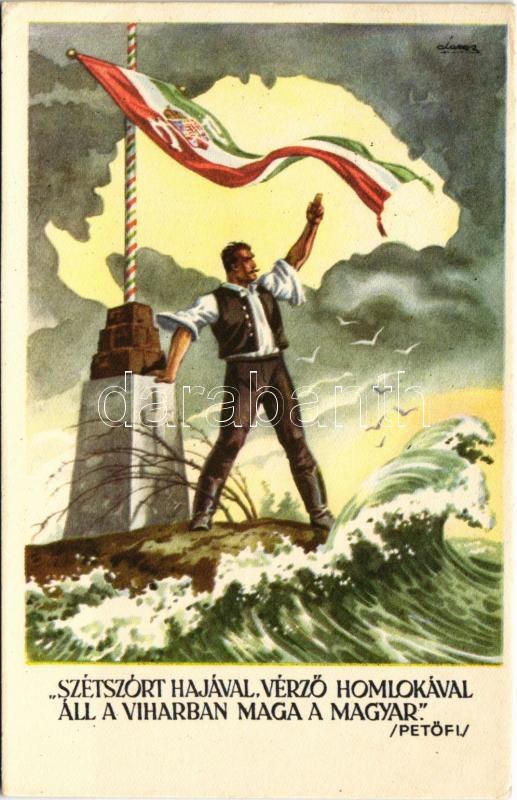 1939 Szétszórt hajával, vérző homlokával áll a viharban maga a magyar. Kiadja az Ereklyés Országzászló Nagybizottsága / Hungarian irredenta propaganda, Hungarian flag, Treaty of Trianon s: Lamoss (EK)