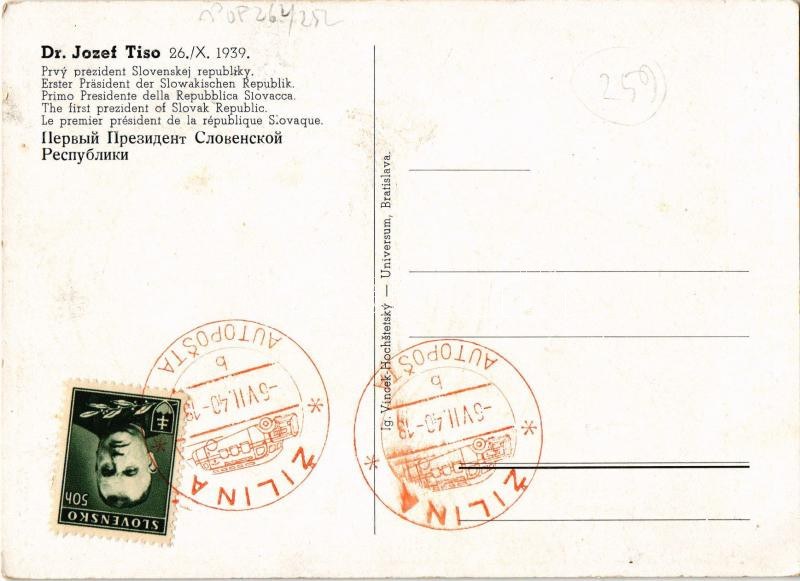 1940 Dr. Jozef Tiso, prvy prezident Slovenskej Republiky / Tisza József, a Szlovák Köztársaság első elnöke / Jozef Tiso, the First President of the Slovak Republic, patriotic propaganda, floral + "ZILINA AUTOPOSTA" So. Stpl. (EK)