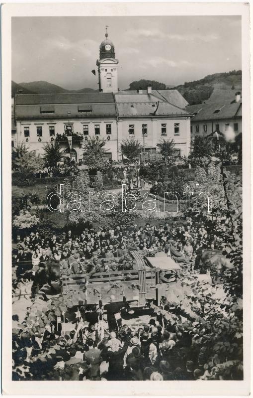 1940 Nagybánya, Baia Mare; bevonulás, teherautó. Hátoldalon emlékbélyegzés magyar szalaggal ...