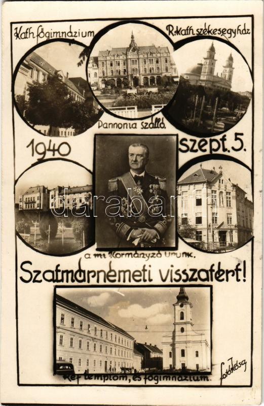 1940 Szatmárnémeti, Satu Mare; bevonulás, Horthy Miklós kormányzó, "Szatmárnémeti visszatért!" Római katolikus főgimnázium és székesegyház, Pannonia szálloda, Református templom és főgimnázium / entry of the Hungarian troops, Regent Horthy. Foto Kósa photo + "1940 Szatmárnémeti visszatért" So. Stpl. (EK)