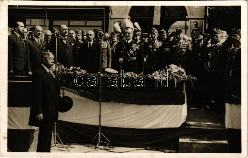 1940 Szatmárnémeti, Satu Mare; bevonulás, vitéz Nagybányai Horthy Miklós Magyarország kormányzója, Teleki Pál, Hóman Bálint, Reményi-Schneller Lajos, Teleki Mihály, vitéz Bartha Károly, Werth Henrik, vitéz Koós Miklós tábornok, vitéz Keresztes-Fischer Lajos / entry of the Hungarian troops, regent Horthy, Hungarian flag + "1940 SZATMÁRNÉMETI VISSZATÉRT" So. Stpl (vágott / cut)