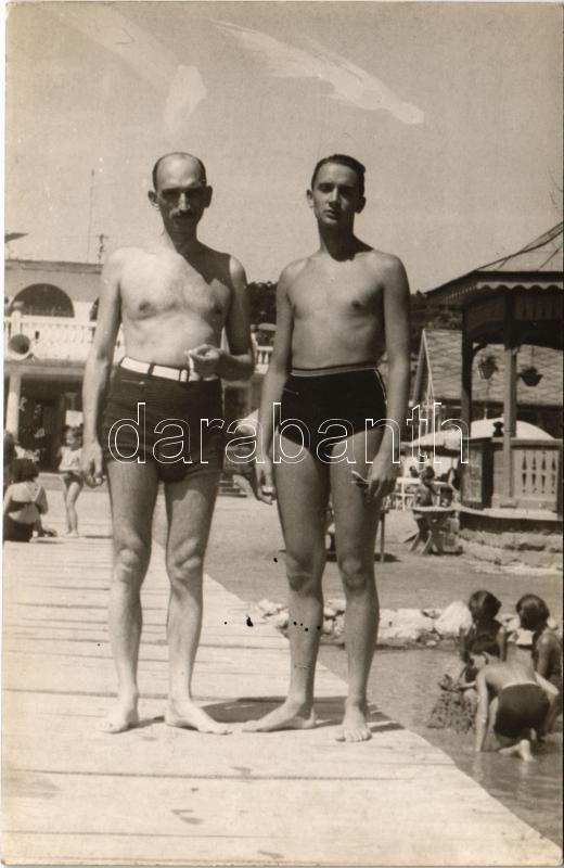 1941 Balatonalmádi, Fövenyfürdő, strand, nyaraló férfiak korabeli fürdőnadrágban. photo