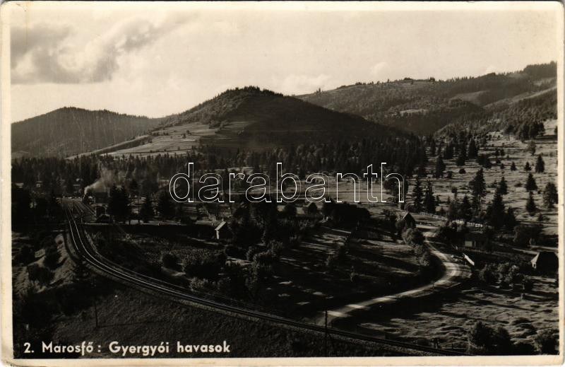 1945 Marosfő, Izvoru Muresului; Gyergyói-havasok, vasútállomás, vonat, gőzmozdony / Muntii Giurgeu / mountain...