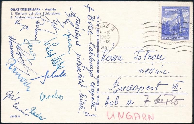 1963 február A BVSC futballistáinak aláírásaival ellátott képeslap: Verebes József (1941-2016)...