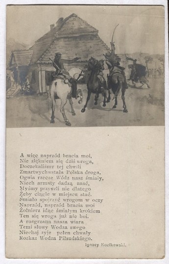 A WIĘC naprzód bracia moi, / Nie zlękniem się dziś wroga, / Doczekaliśmy tej chwili / Zmartwychwstała Polska droga [...]...