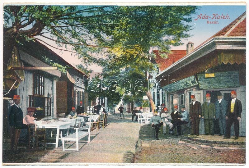 Ada Kaleh, Bazár, török üzletek és kávézó, osztrák-magyar katonák / Turkish bazaar, shops and cafe, K.u.k. soldiers ...
