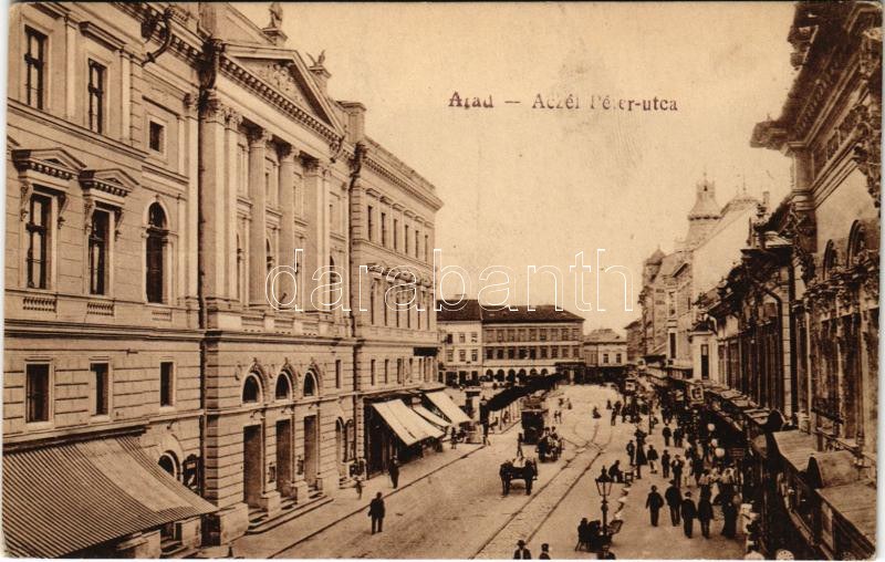 Arad, Aczél Péter utca, autóbusz, üzletek. Oláh Sándor és Társa kiadása / street view, autobus, shops (EK...
