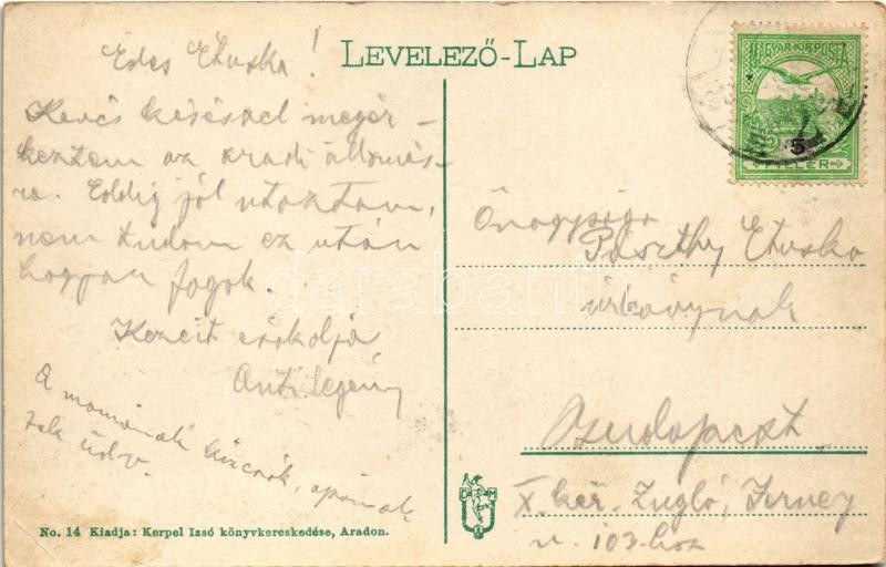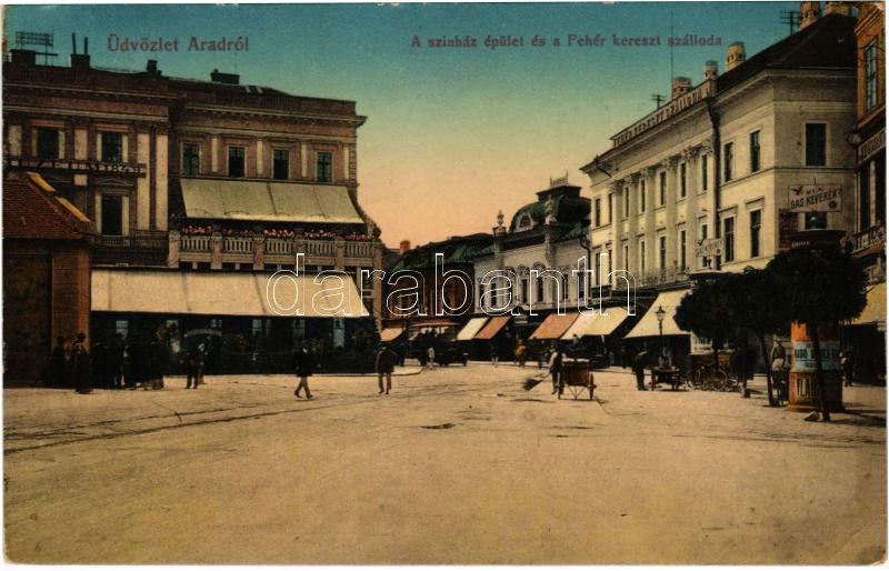 Arad, színház, Fehér Kereszt szálloda, 1848-1849 múzeum, Neumann üzlete, Mi a Sas-Keverék? Kerpel Izsó No. 14. / theatre, hotel, shop (EK)