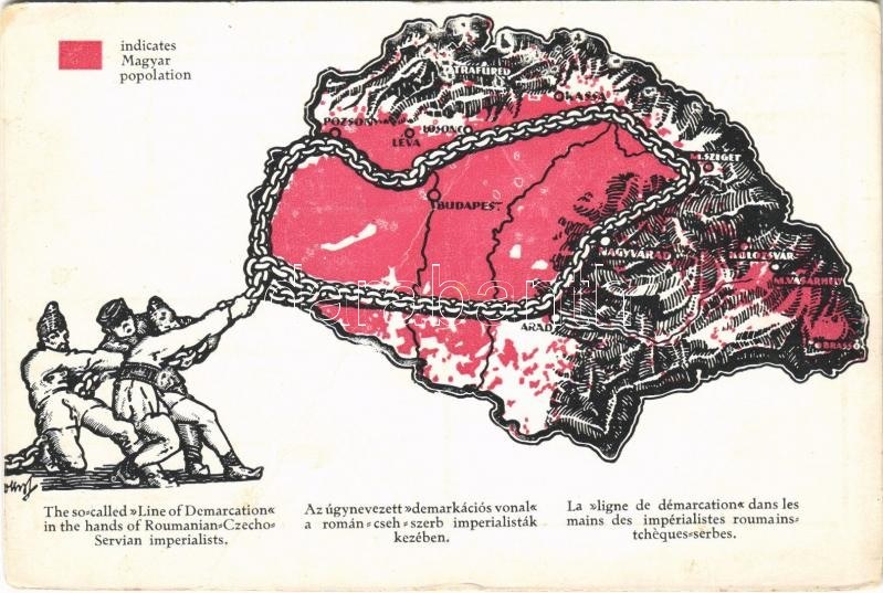 Az úgynevezett demarkációs vonal a román-cseh-szerb imperialisták kezében. Patria rt. kiadása / Hungarian irredenta art postcard s: Hollós (fa)