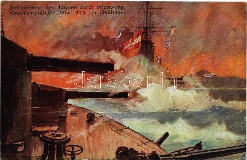 Beschießung des Lovcen durch österr.-ung. Großkampfschiffe Detail 30.5 cm Geschütze / Lovcen bombázása 30.5 cm löveggel / WWI Austro-Hungarian Navy, K.u.K. Kriegsmarine, bombardment of Lovcen with 30.5 cm cannons. Österreichischen Flottenverein s: Harry Heusser (EB)