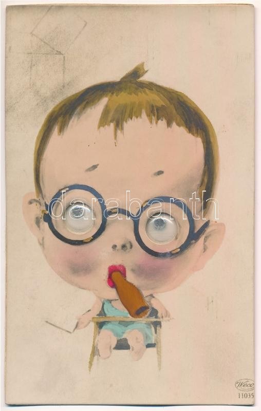 "Bineo Optika" (Bienenstok L. és fia) mechanikus reklámlapja mozgó szemű kisfiúval. Budapest, Deák Ferenc utca 23. / Hungarian optical shop's mechanical advertising postcards, boy with moving eyes. Weco 11035 (fl)