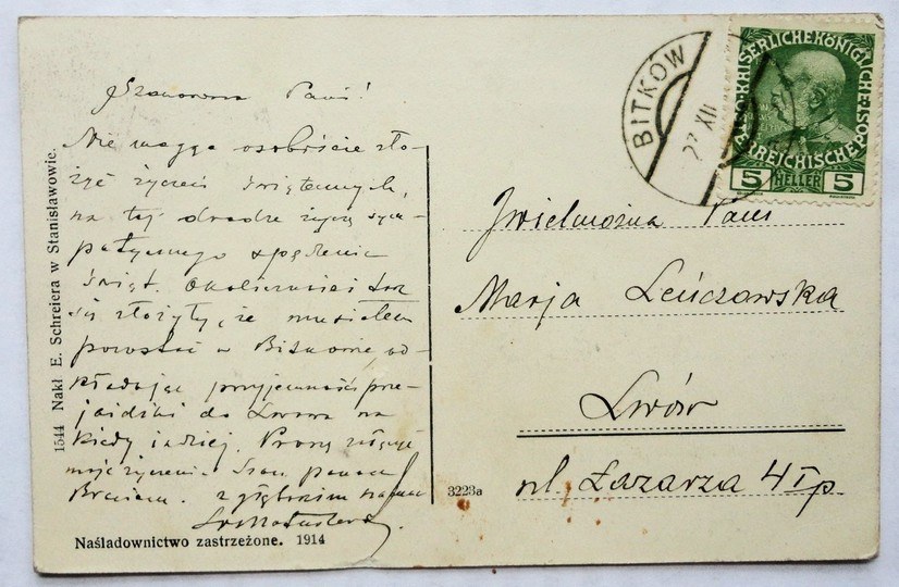 1544 Nakł. E. Schreiera w Stanisławowie. 3223a. 1914. Z korespondencją, znaczkiem i stemplem pocztowym. Tytuł również po rosyjsku i niemiecku. Stan dobry.