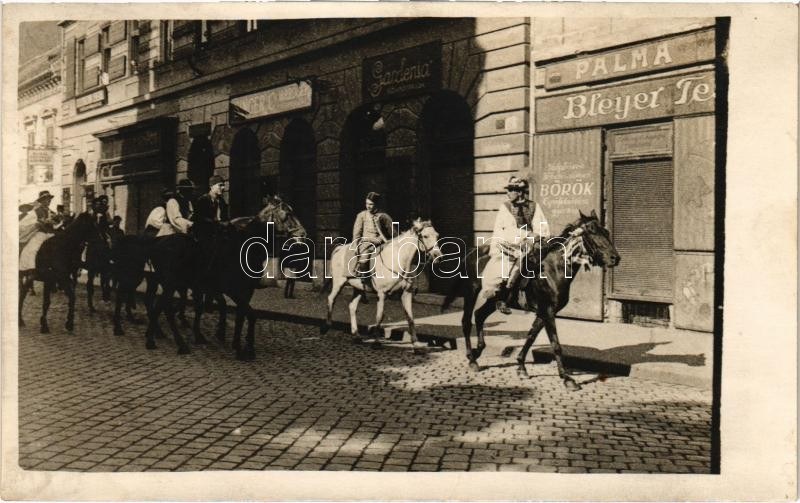 Budapest I. Fő utca és Corvin tér 1., Bleyer Testvérek, Singer Co. varrógépek és "Gardenia" élő és művirág üzlet, lovasok népviseletben. photo