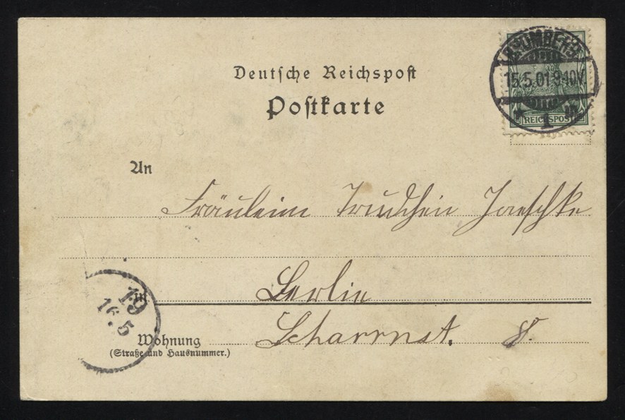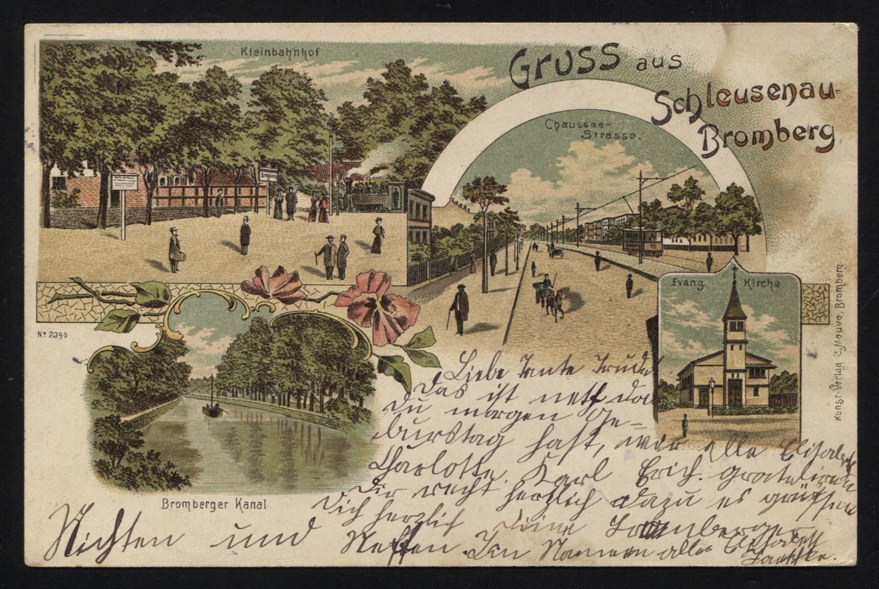 Korespondencja dat. [19]01. 4 widoki: Kleinbahnof, Chaussee - Strasse, Bromberger Kanal, Evang. Kirche. Stan bardzo dobry. Zob. ilustr. s. 27.