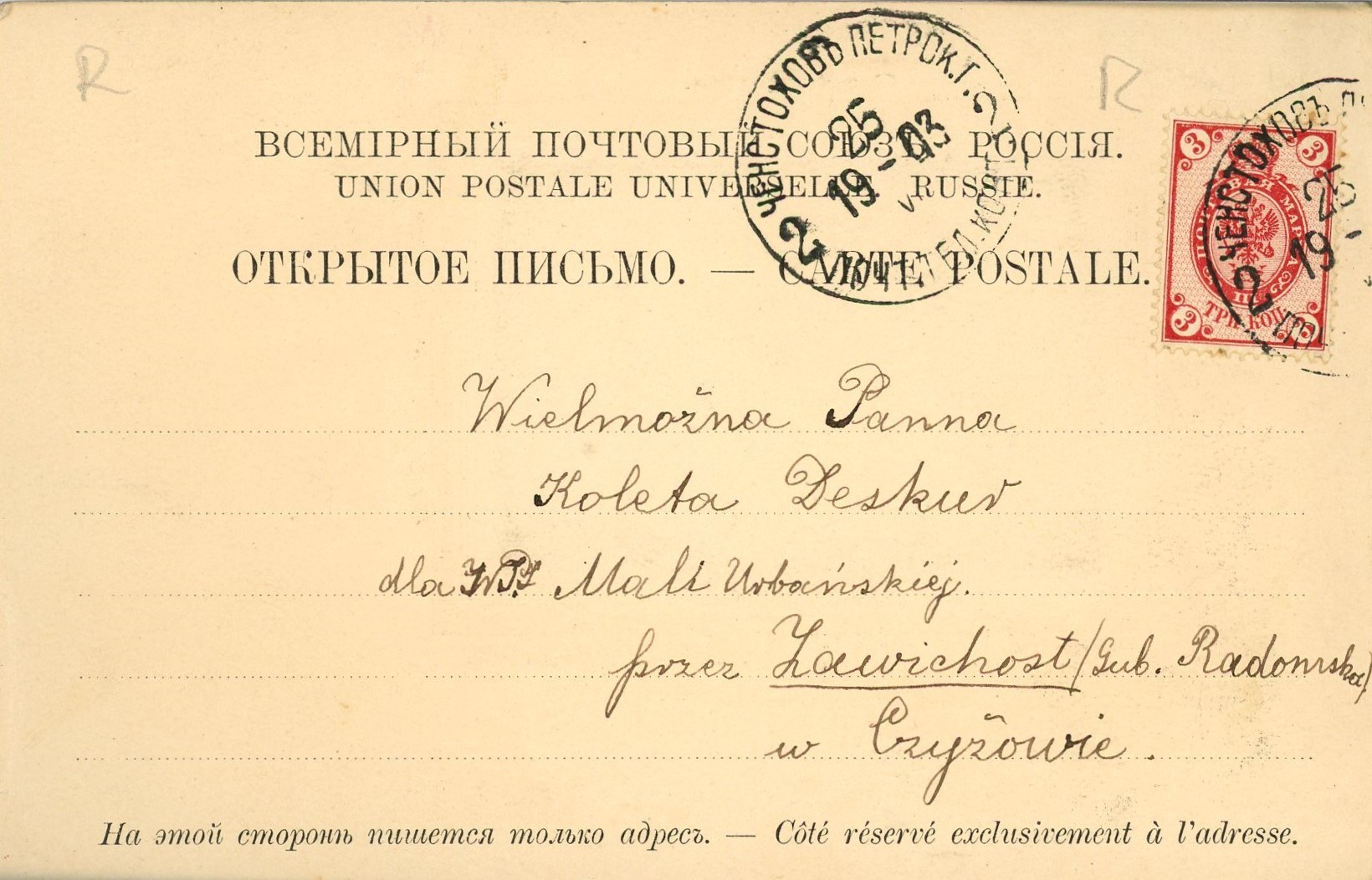For. S. Trzciński, Warszawa. Kartka zapisana, dat. 5.8.1903 r. Stan bardzo dobry. Bardzo rzadka.