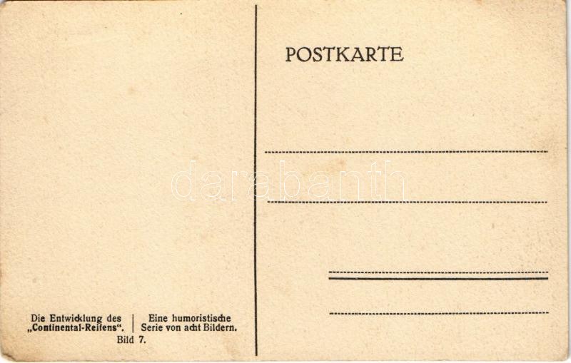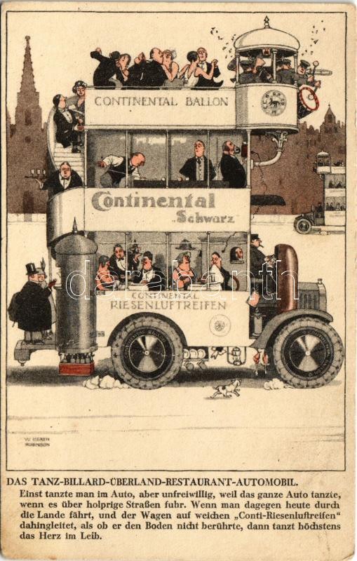 Das Tanz-Billard-Überland-Restaurant-Automobil. Die Entwicklung des Continental-Reifens Bild 7. / Humorous serie of the development of the Continental automobile tire / Humoros képeslap sorozat a Continental autógumi (gumiabroncs) fejlesztéséről s: W. Heath Robinson