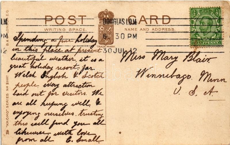 Douglas (Isle of Man), Promenade, tram, horse-drawn trams, Villiers Hotel and Buffet. Kromo Series No. 21887. (EK...