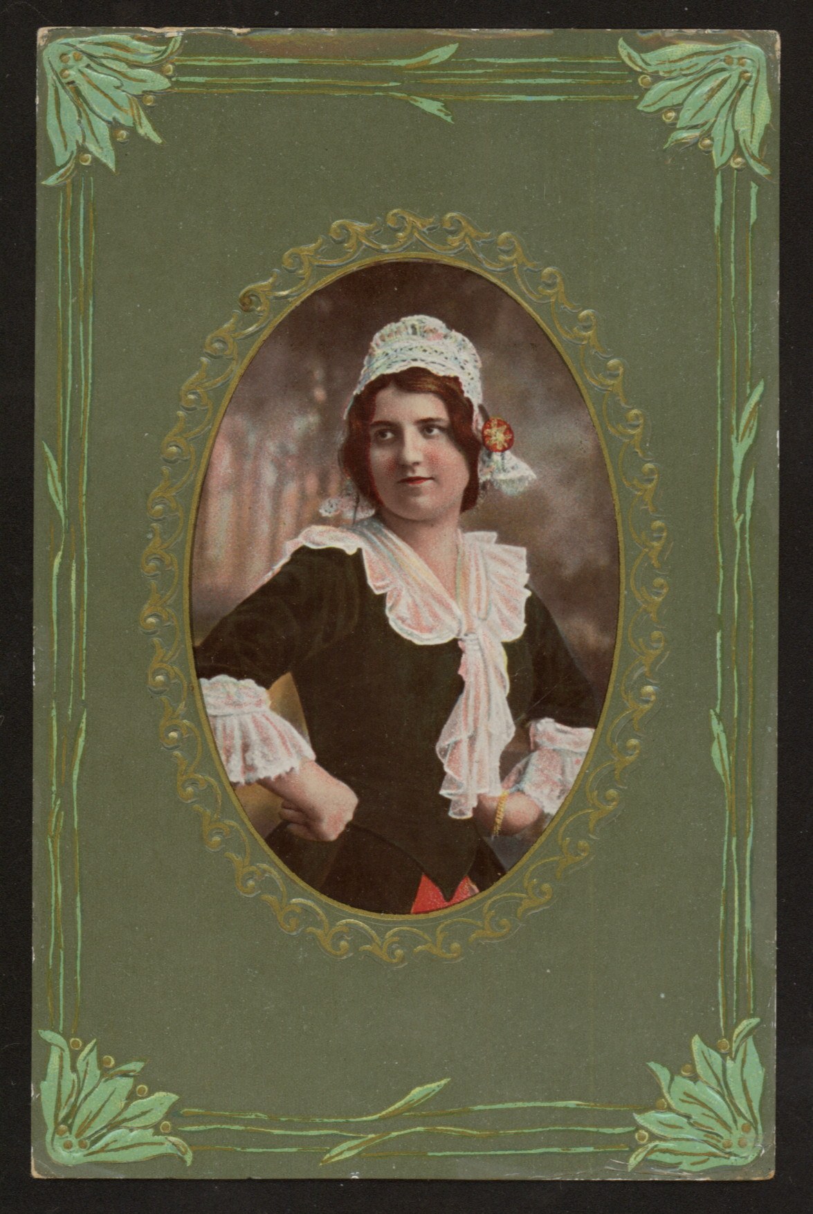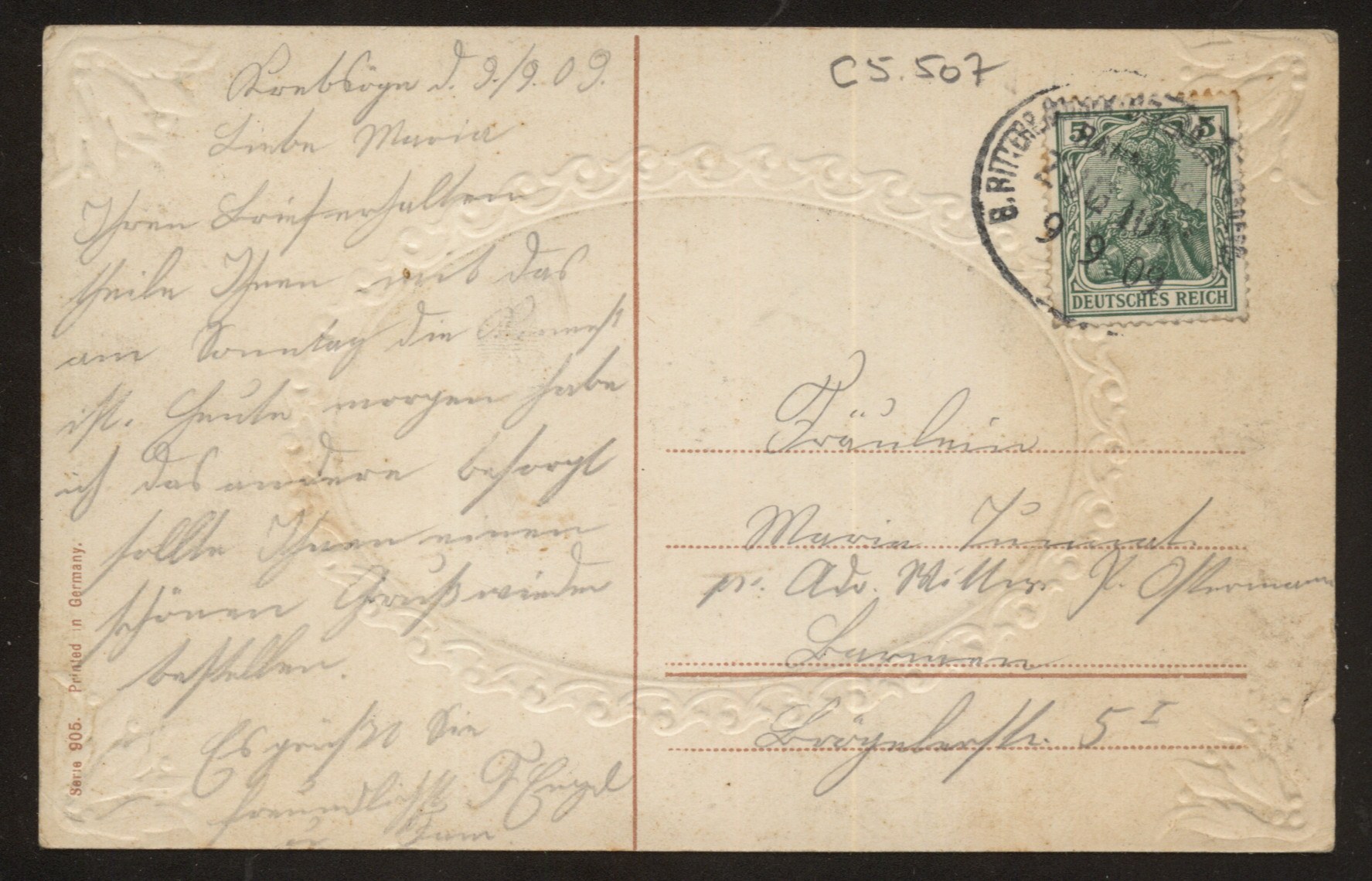 Dziewczyna.Oryginalna,tłoczona widokówka z datą obiegu i korespondencji 9.09.1909 r..Wydano w Niemczech