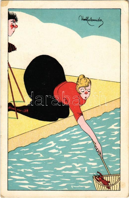 Erotic humour art postcard, photographer with lady and shrimp. M. N. & C. Milano No. 6576. artist signed (EK...