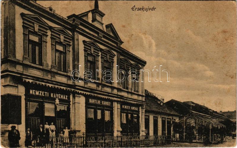 Érsekújvár, Nové Zámky; Bartlik Károly Nemzeti kávéháza, Központi kávéház. Vasúti levelezőlapárusítás 16. 1918. / café ...