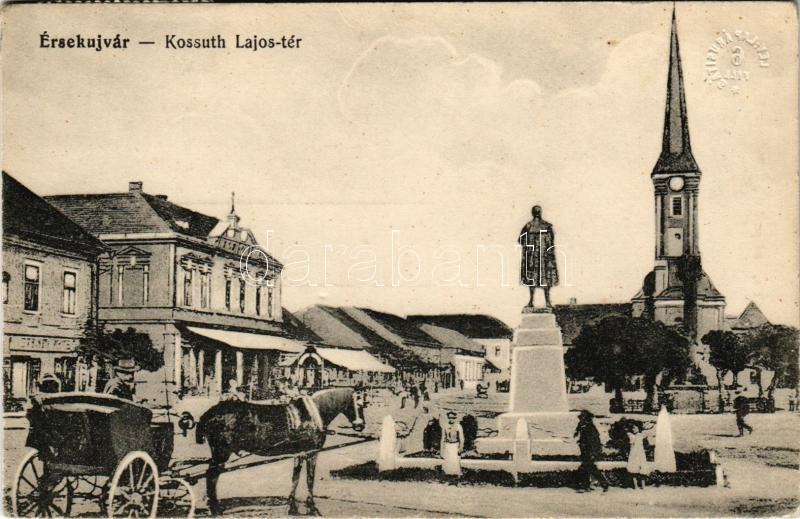 Érsekújvár, Nové Zámky; Kossuth Lajos tér, Nemzeti szálloda, templom, üzletek. Vasúti levelezőlapárusítás 5724. / square, hotel, church, shops