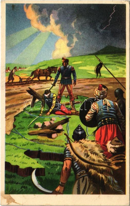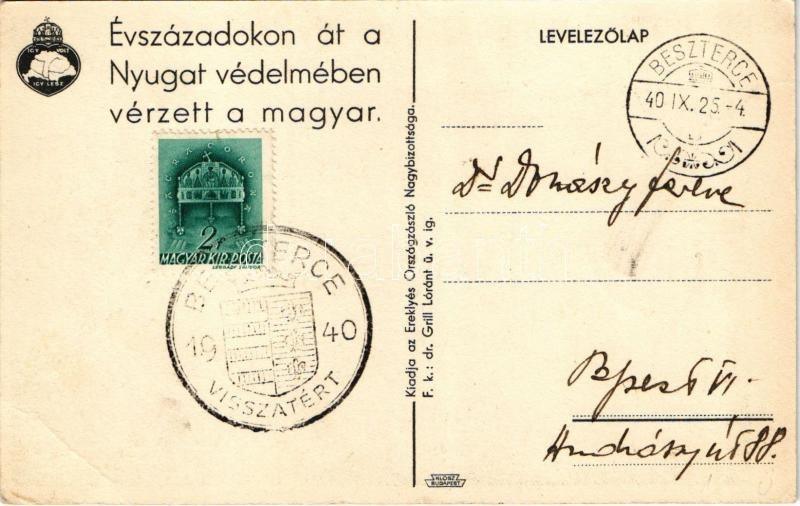Évszázadokon át a Nyugat védelmében vérzett a magyar. Kiadja az Ereklyés Országzászló Nagybizottsága / Hungarian irredenta propaganda art postcard, Treaty of Trianon (EB) + "1940 Beszterce visszatért" So. Stpl