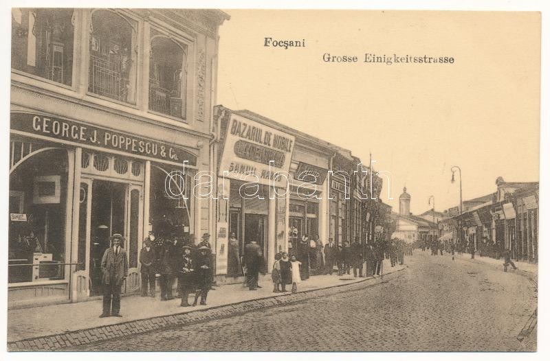 Focsani, Foksány (Moldavia); Grosse Einigkeitstrasse / Bazarul de mobile La Centrala Samuil Marcu, George J. Poppescu & Co., Mode E. Spigler / street, shops
