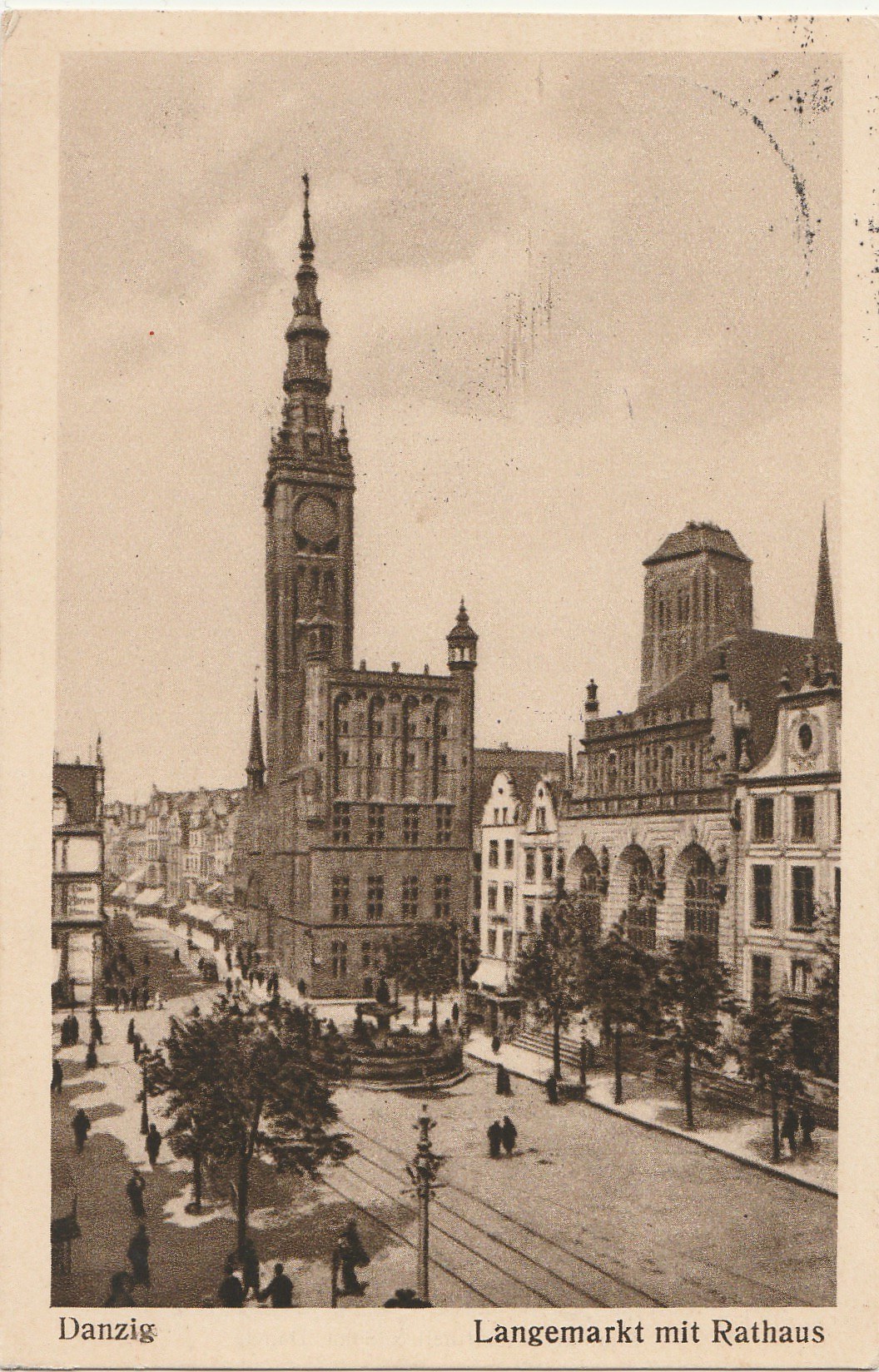 GDAŃSK. Danzig / Langemarkt mit Rathaus, wyd. Danziger Verlags-Gesellschaft m.b. H., Danzig, ok. 1925; cz.-b., stan db, niewielkie zabrudzenia, przebicie stempla, z obiegiem.