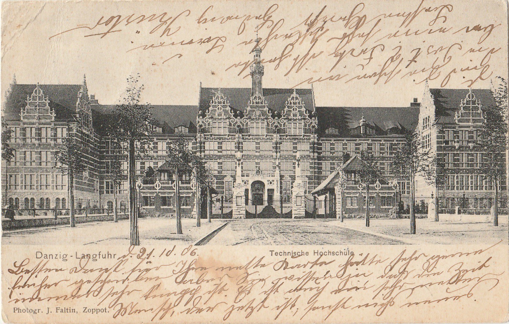 GDAŃSK. Danzig–Langfuhr / Technische Hochschule, wyd. Clara Bernthal, Danzig, 1904; cz.-b., stan db, odręczne dopiski na górze i na dole, z obiegiem.