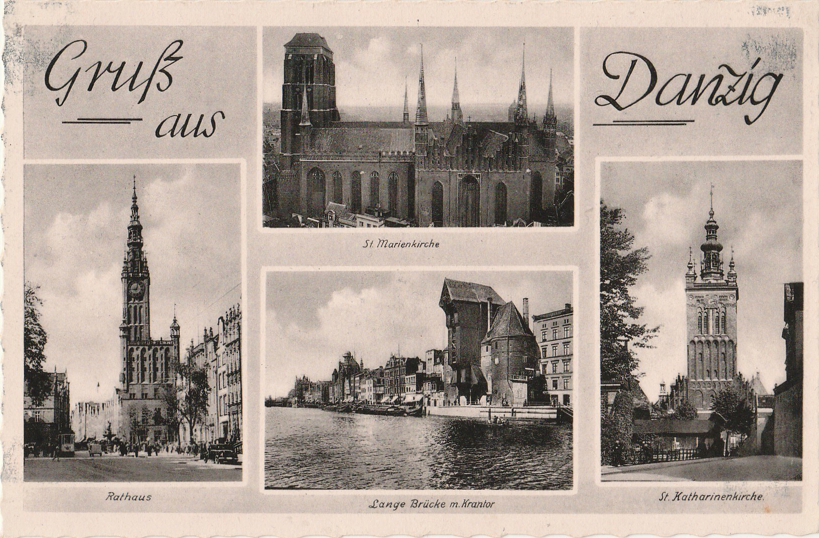 GDAŃSK. Gruß aus Danzig / Rathaus / St. Marienkirche / Lange Brücke m. Krantor / St. Katharinenkirche, wyd. L. Steinhoff, Danzig, ok. 1941; cz.-b., stan db, drobne zabrudzenia, nierówne brzegi, bez obiegu.