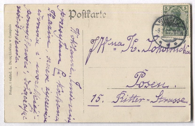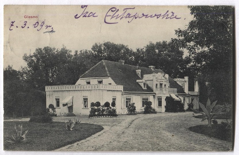 Fotogr. i nakład. L. Durczykiewicza w Czempiniu. Dwór w wielkopolskim Glesnie, wybudowany na przełomie XVIII/XIX w., będący własnością Bnińskich, później Chłapowskich. Z korespondencją i znaczkiem. Data stempla 8 III 1909. Stan dobry.
