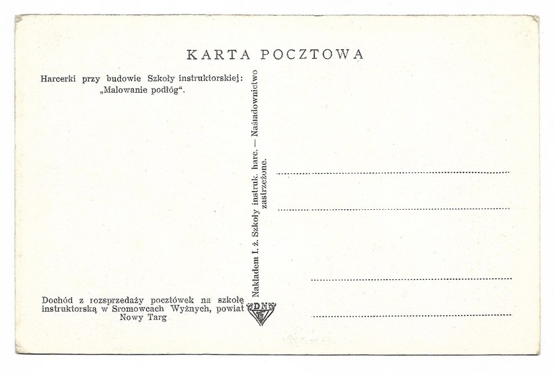 Nakładem I ż. Szkoły instruk. harc. Dochód z rozsprzedaży pocztówek na szkołę instruktorską w Sromowcach Wyżnych, powiat Nowy Targ. Wczesna lata 30. XX w. [Druk] DN [= Drukarnia Narodowa, Kraków]. Bez korespondencji i znaczka. Niewielkie otarcia.